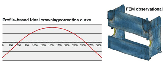 The Ideal Curve Crowning System is created by conducting FEM analysis of the frame in pursuit of the ideal correction curve with respect to crowning which becomes a problem for the press brakes. Simple and fine adjustment is enabled with use of a monoaxial curving wedge. Automatic crowning adjustment is made quickly for each bending step without stress.