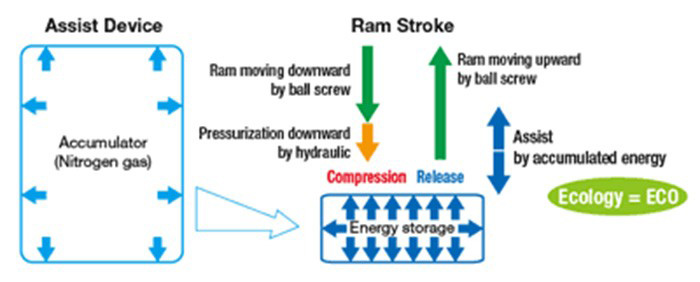 Different from conventional servo hydraulic mechanisms which continuously control high-speed movement and pressure movement of the ram, the Dual Drive System separately controls high-speed up and down movement by AC servo motor and ball screw drive and hydraulic pressure movement. By the Dual Drive System, high-speed downmovement at 200mm/sec and stable repeat-stop accuracy by AC servo motor and hydraulic drive are enabled, realizing high productivity. In addition, the Dual Drive System is superior in total energy saving because it is fitted with a assist device that stores the energy of down movement and returns it during ram up movement.